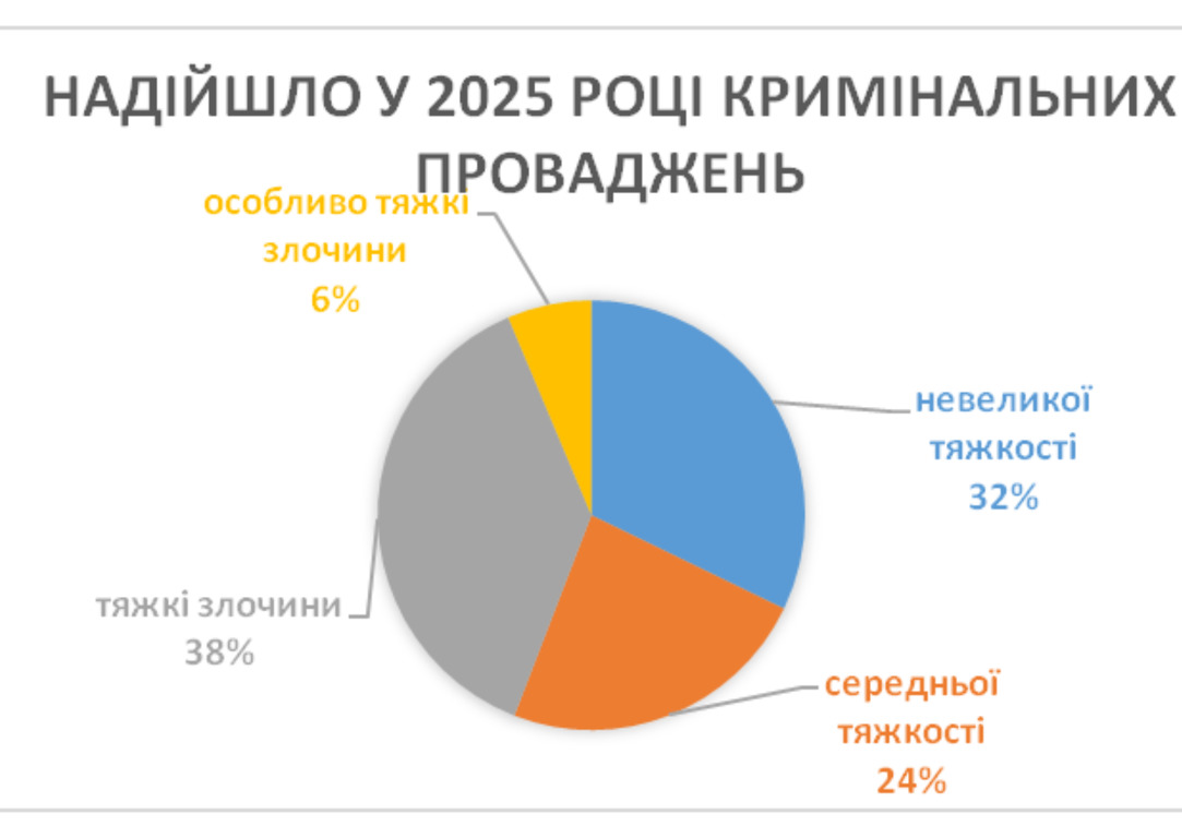 Найбільший відсоток у загальному числі кримінальних проваджень з обвинувальним актом, що надійшли до суду, у 2025 році складають провадження про злочини у сфері обігу наркотичних засобів – 23,4% (в 2024 р.–36,6 %);
