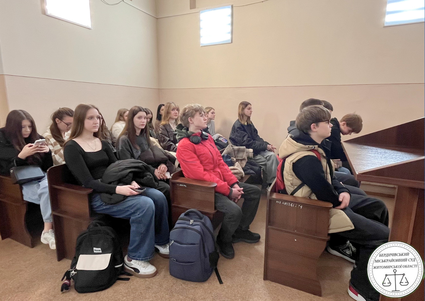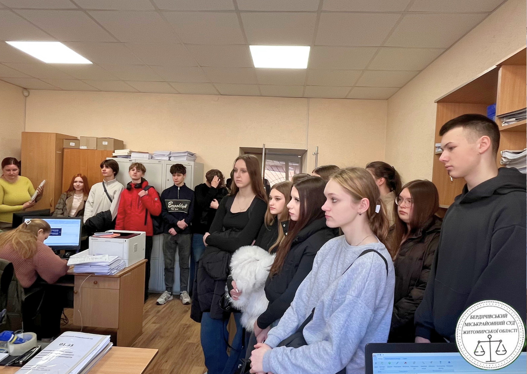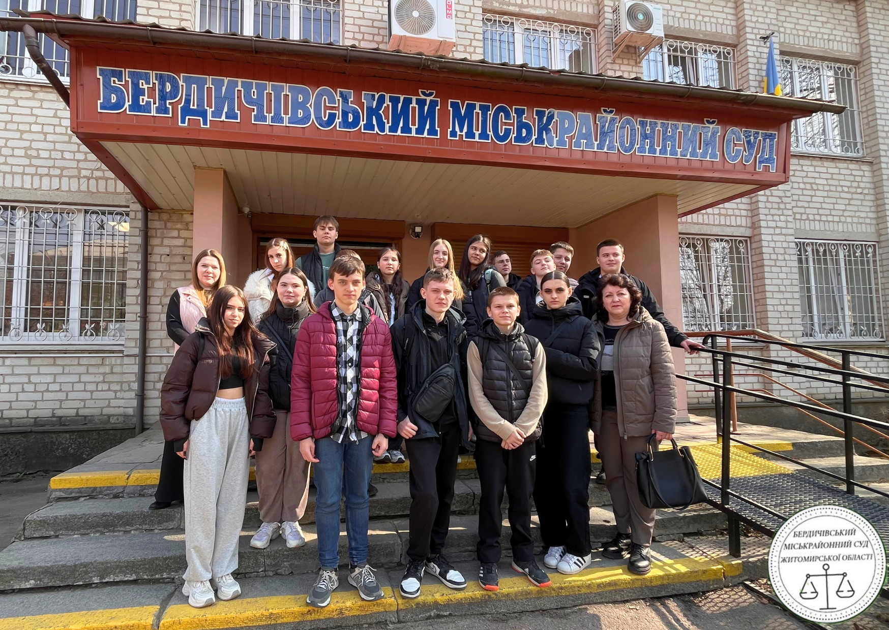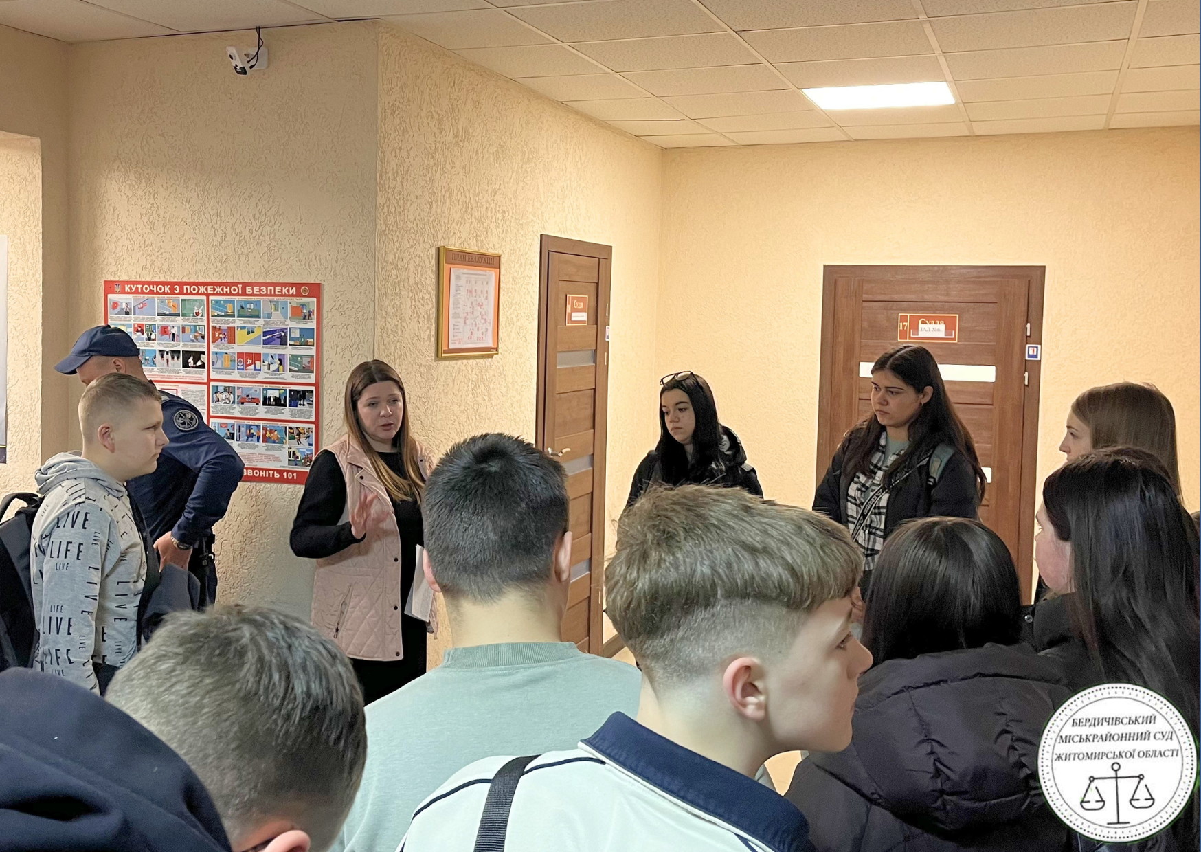 Бердичівський міськрайонний суд відчинив свої двері для школярів – на екскурсію запросили учнів двох дев’ятих класів Бердичівської міської гуманітарної гімназії №2. Мета заходу - познайомити підлітків із судовою системою та юридичною професією, підвищити рівень їхньої правової культури, показати роботу Феміди зсередини.