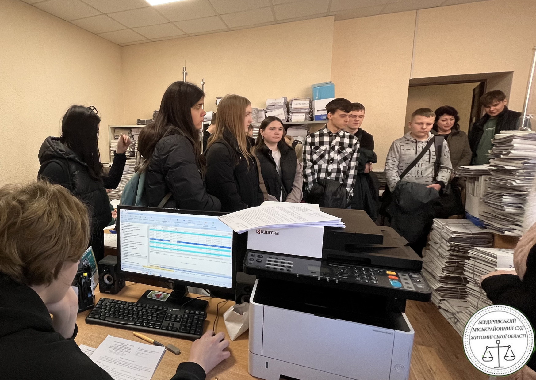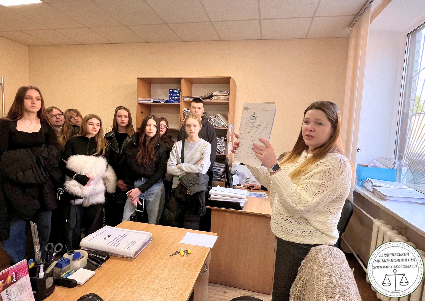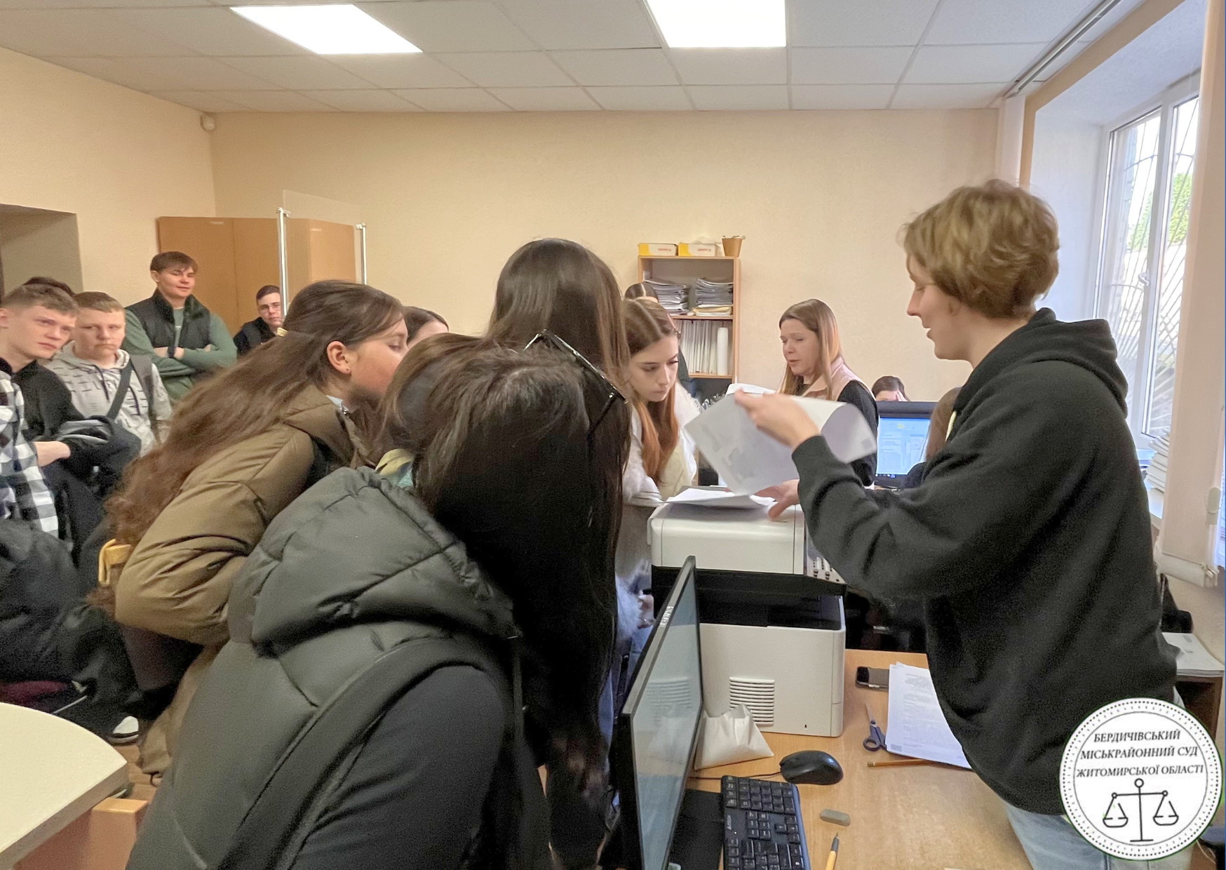 Бердичівський міськрайонний суд відчинив свої двері для школярів – на екскурсію запросили учнів двох дев’ятих класів Бердичівської міської гуманітарної гімназії №2. Мета заходу - познайомити підлітків із судовою системою та юридичною професією, підвищити рівень їхньої правової культури, показати роботу Феміди зсередини.