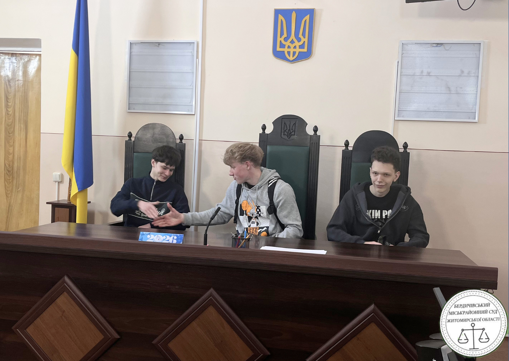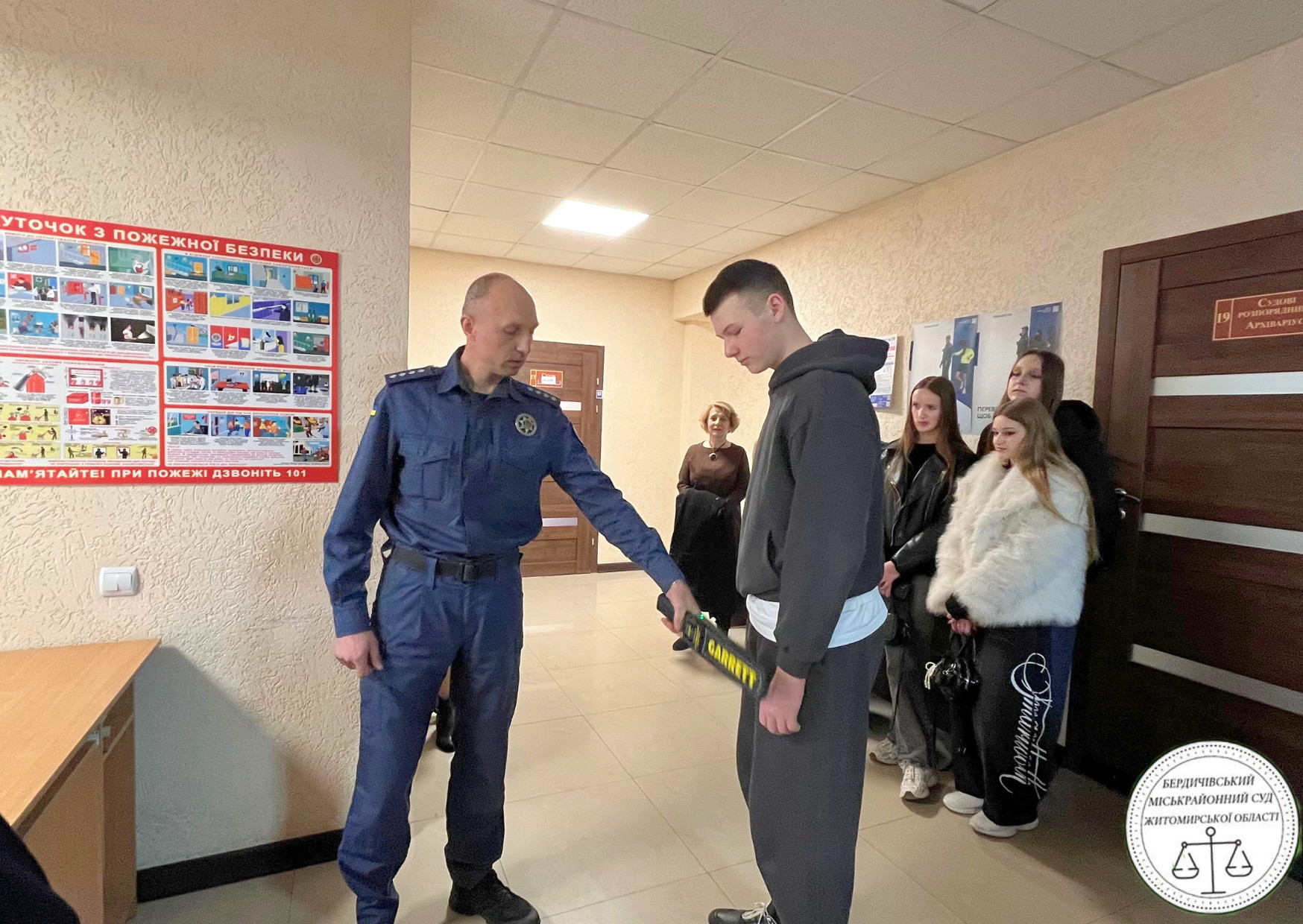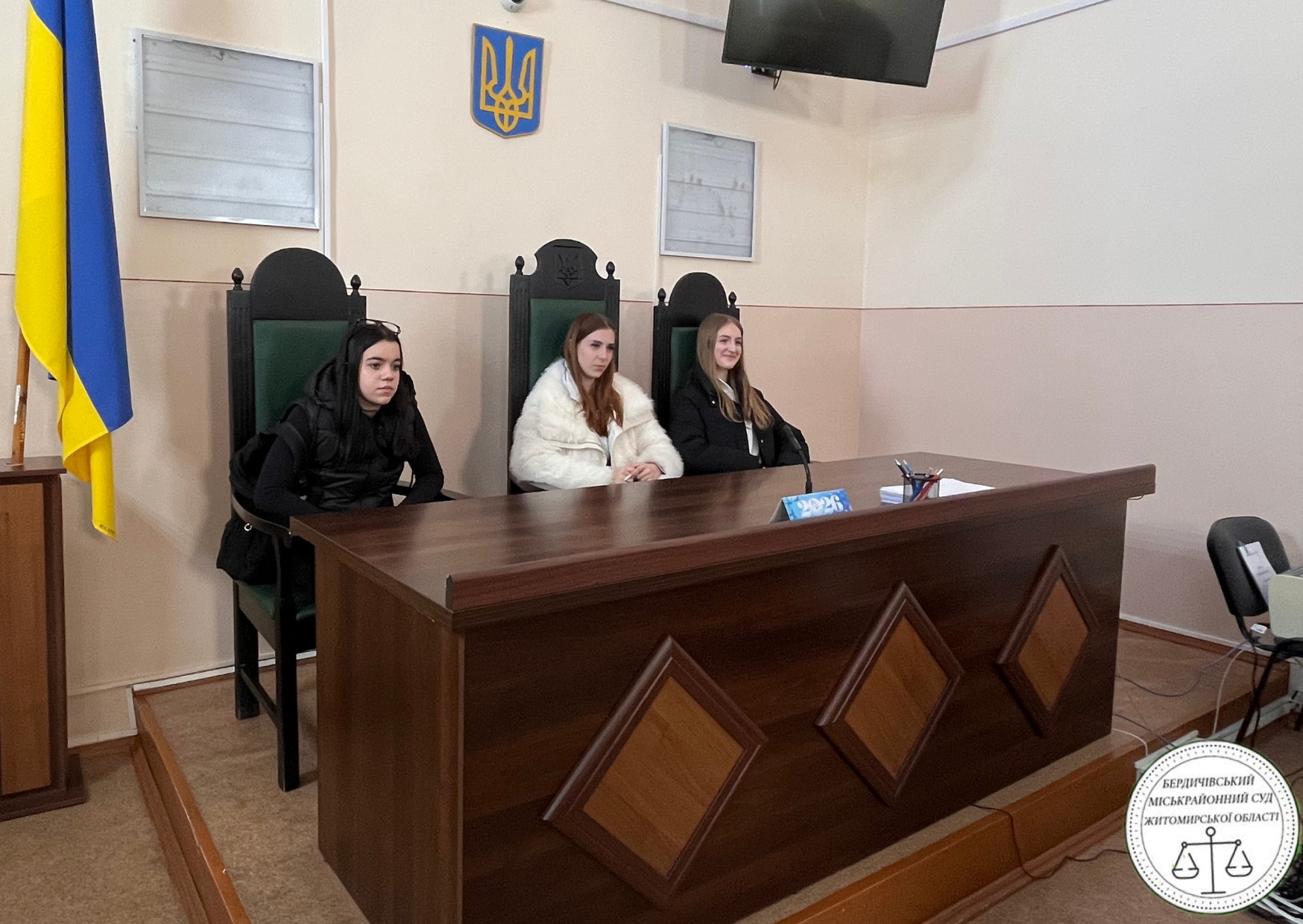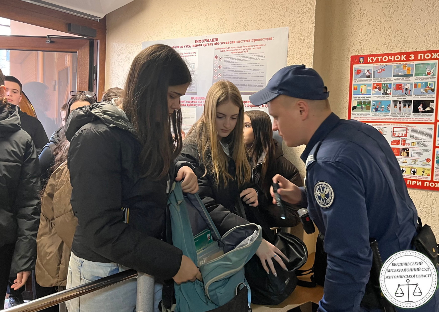 Бердичівський міськрайонний суд відчинив свої двері для школярів – на екскурсію запросили учнів двох дев’ятих класів Бердичівської міської гуманітарної гімназії №2. Мета заходу - познайомити підлітків із судовою системою та юридичною професією, підвищити рівень їхньої правової культури, показати роботу Феміди зсередини.