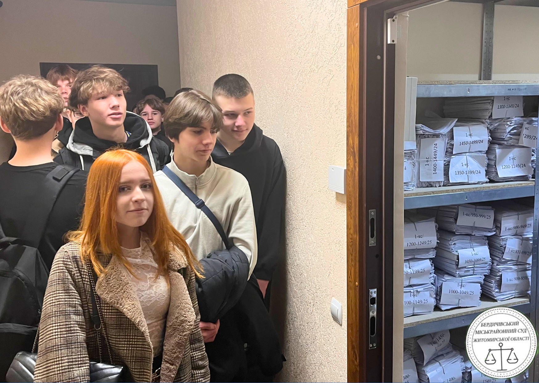 Учні відвідали конвойне приміщення, де дізналися про особливості утримання осіб під вартою під час судових розглядів; зазирнули до архіву суду та побували в канцелярії. Тут працівники суду розповіли, як налагоджений документообіг — від реєстрації позову до винесення рішення, показали як формуються справи, пояснили, як вони розподіляються між суддями.