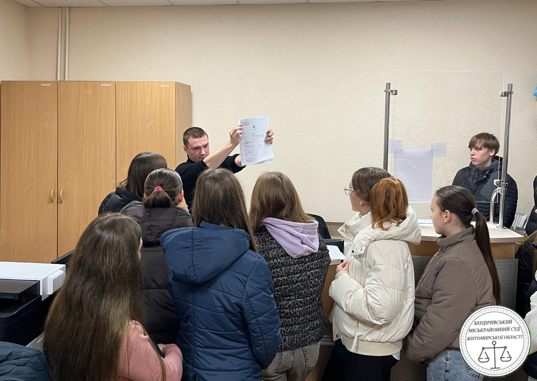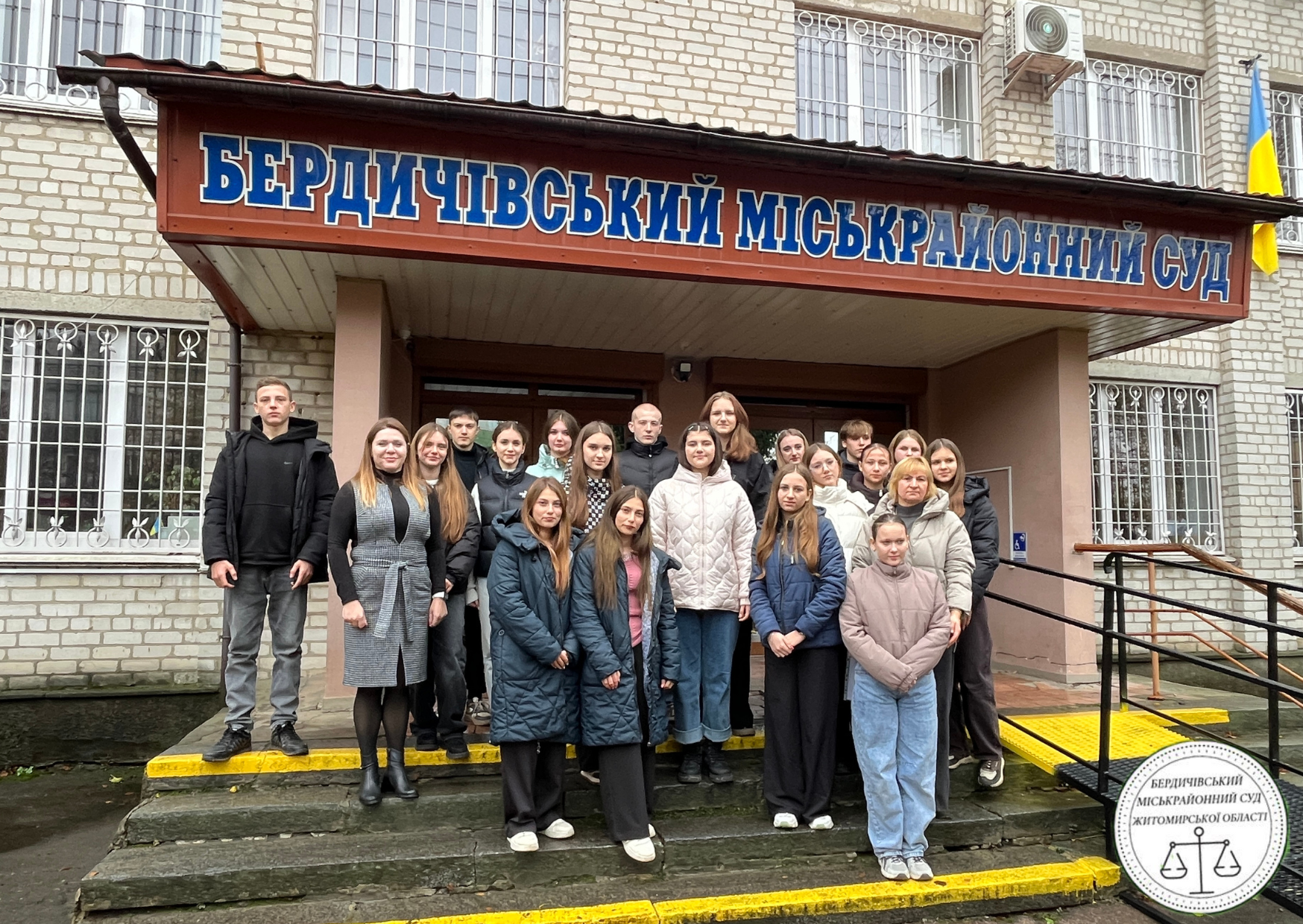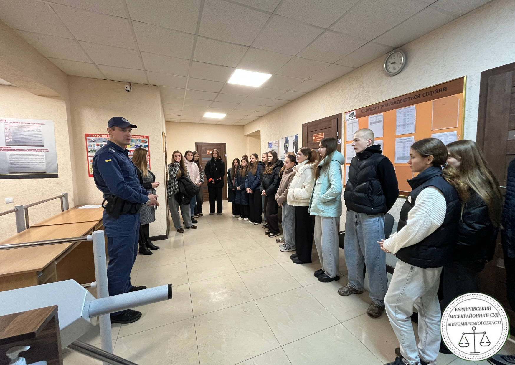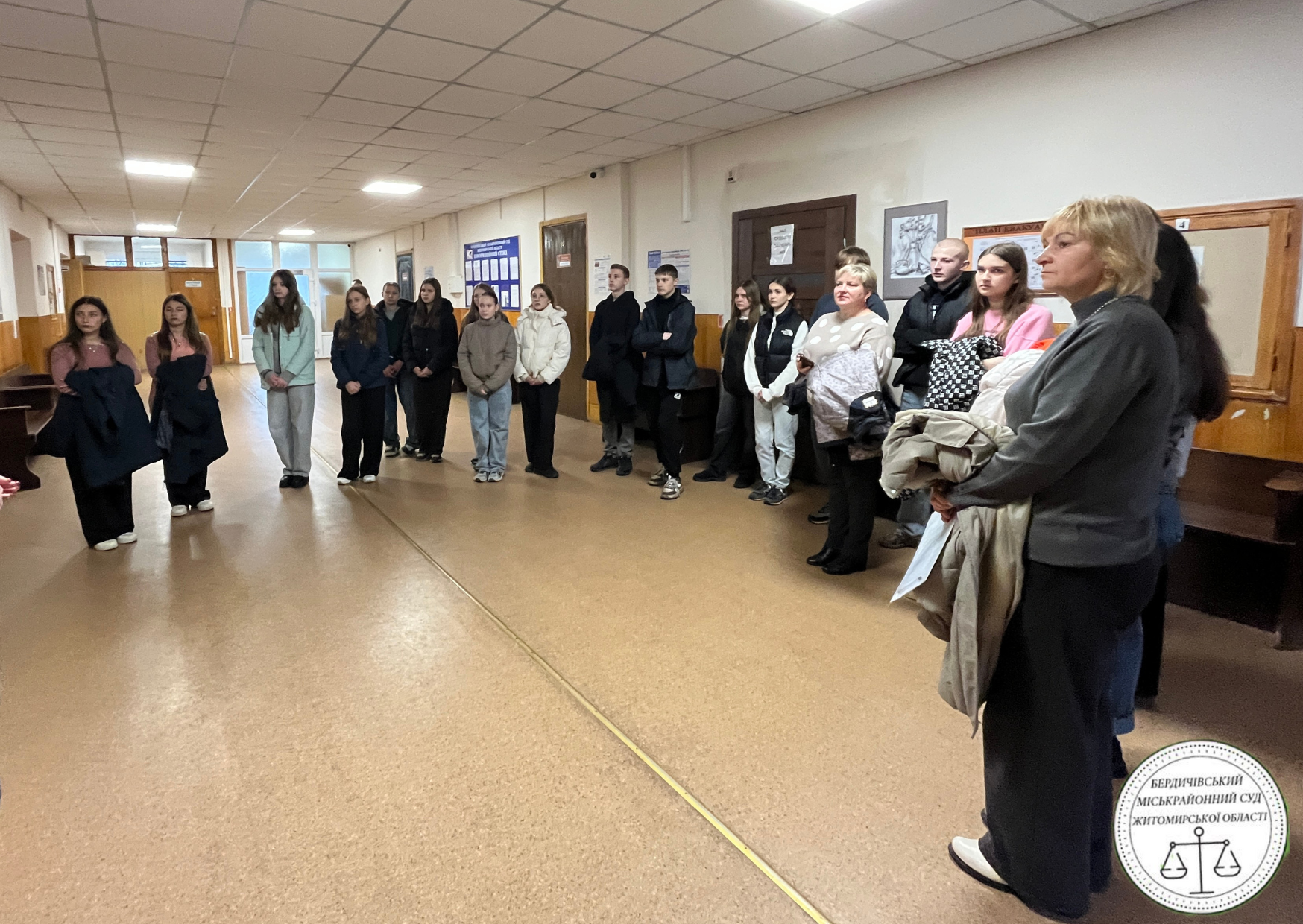 У Бердичівському міськрайонному суді відбулася пізнавальна екскурсія для учнів Хажинського ліцею. Учні дев’ятого та одинадцятого класів мали можливість побачити, як працює суд ізсередини, ознайомитися із професіями, пов’язаними з правосуддям, та поставити запитання працівникам установи. Екскурсія відбулася у межах місячника профорієнтації, який триває у навчальному закладі.