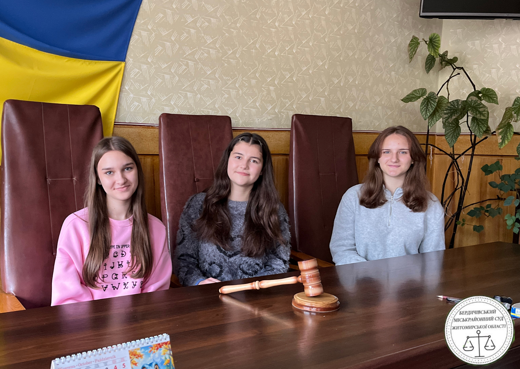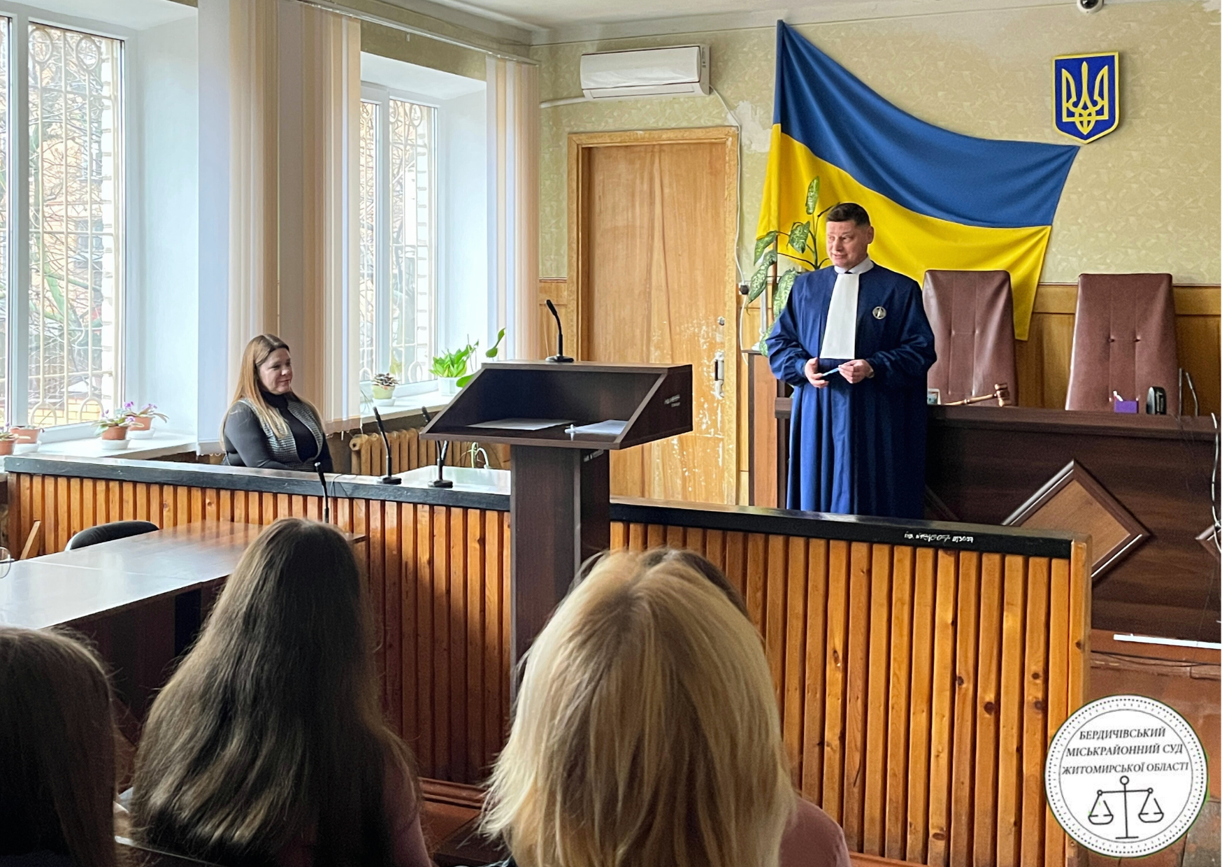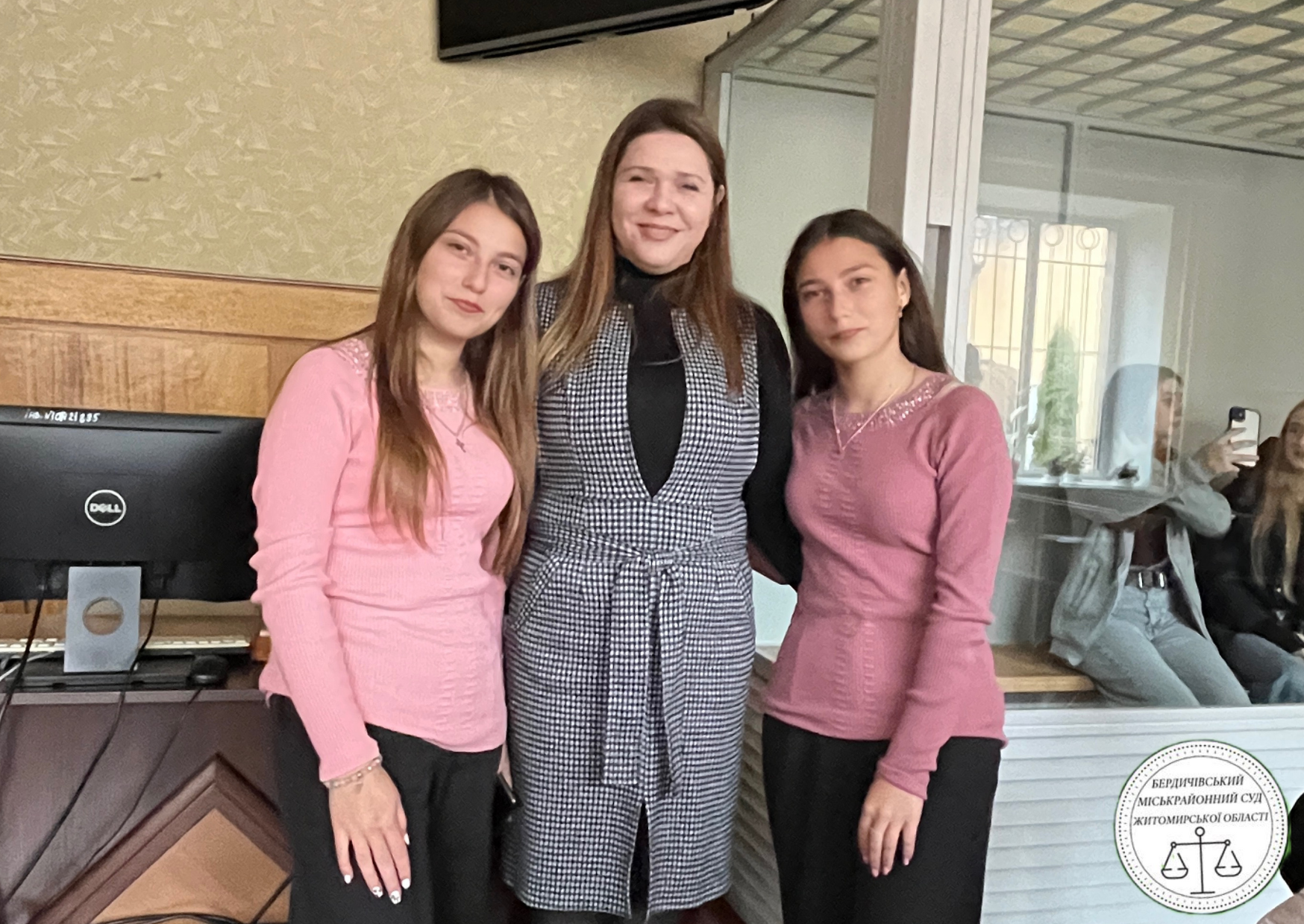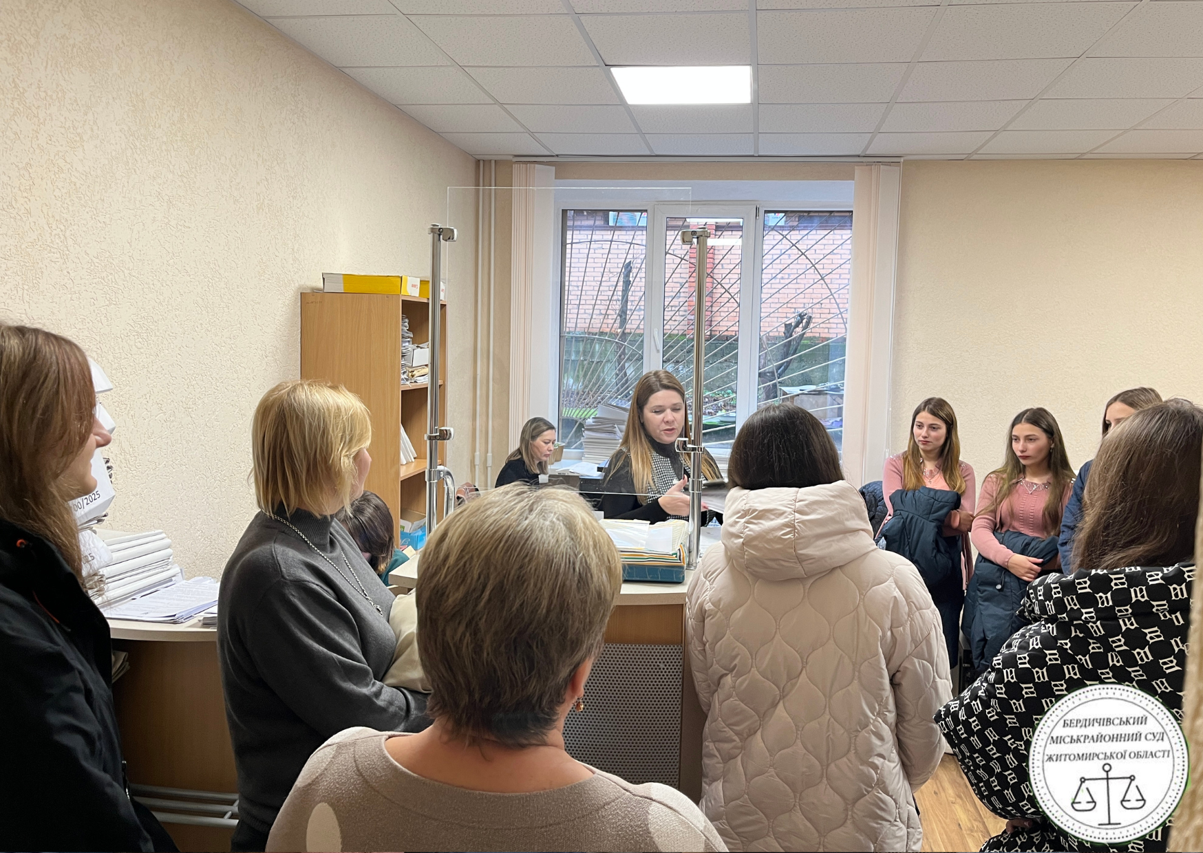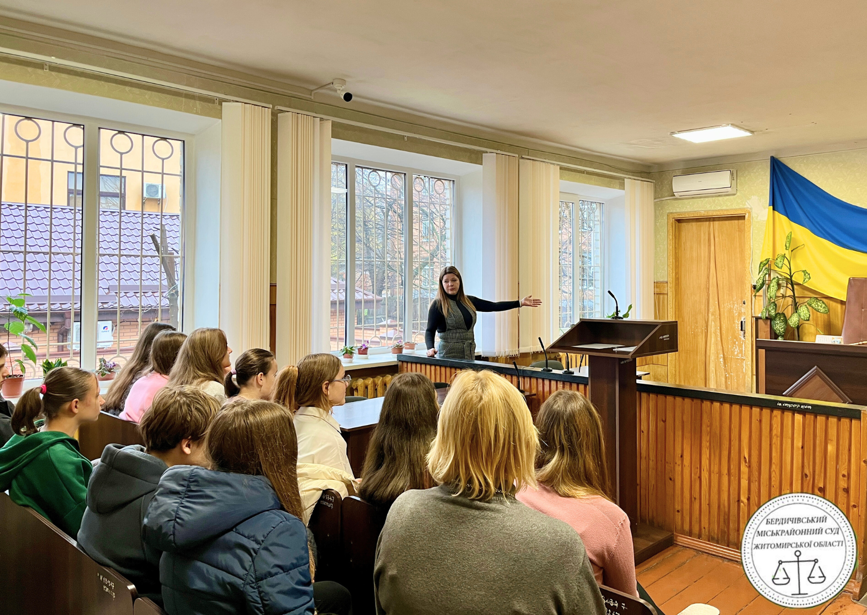 У Бердичівському міськрайонному суді відбулася пізнавальна екскурсія для учнів Хажинського ліцею. Учні дев’ятого та одинадцятого класів мали можливість побачити, як працює суд ізсередини, ознайомитися із професіями, пов’язаними з правосуддям, та поставити запитання працівникам установи. Екскурсія відбулася у межах місячника профорієнтації, який триває у навчальному закладі.