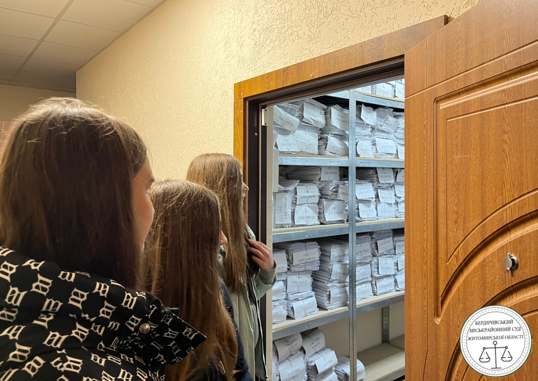 Після цього учні завітали до канцелярії – місця, де розпочинається життя кожної справи у суду. Секретар суду Данило Боровічук, молодий працівник суду, розповів про реєстрацію вхідної кореспонденції, порядок руху справ та важливість точності в роботі канцелярії. Під час огляду архіву екскурсанти дізналися, де, як та у яких кількостях зберігаються матеріали судових справ та про терміни зберігання для кожної категорії справ.